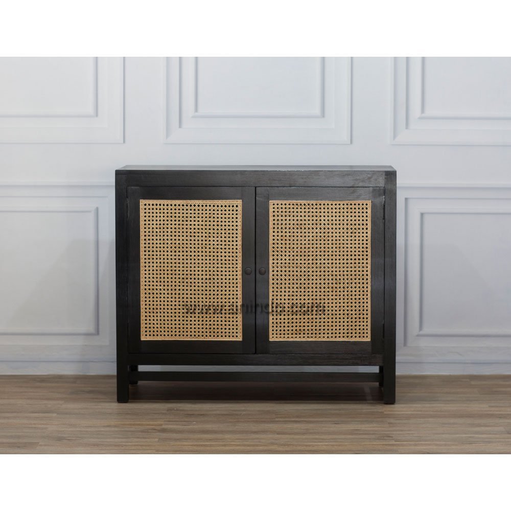 Queensland buffet 2 doors is made of sustainable solid mango wood with natural rattan on doors. Antique black finish. Antique solid brass handles.