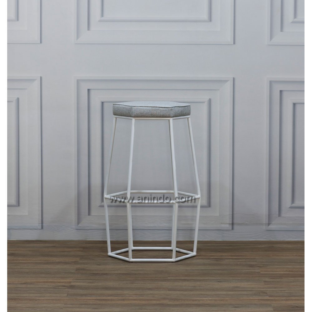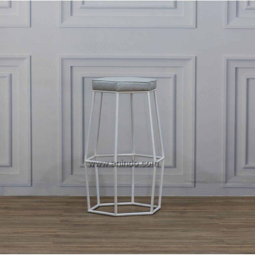 Rockwall bar stool is made of iron. White painted finish. Upholstered in light grey fabric. Match to Rockwall Bar Table