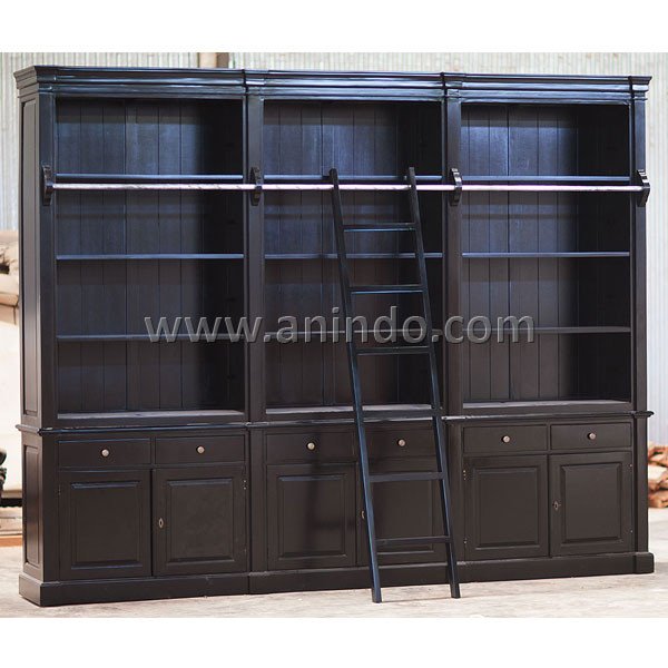 3 section library bookcase is made of solid hard wood in black painted finish.