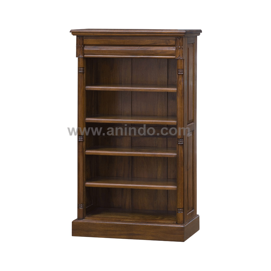 4 shelves open bookcase with drawer is made of solid mahogany wood in pecan finish.