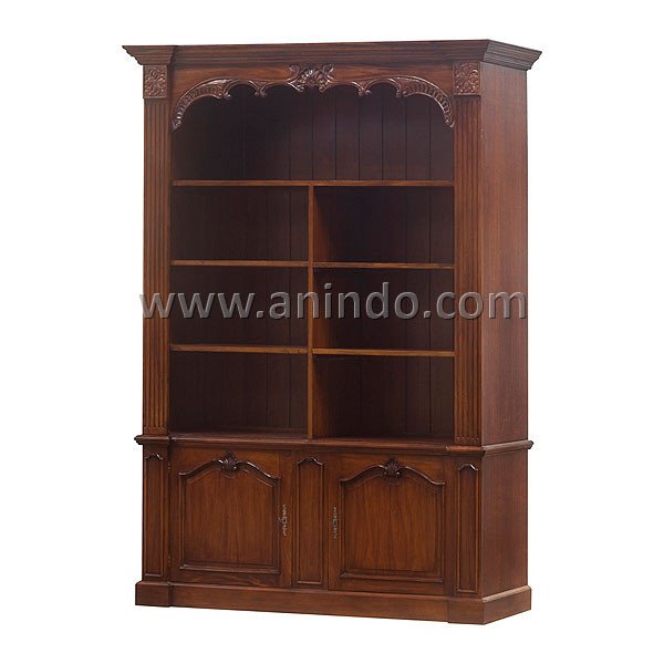 Bookcase 2 drawers carver is made of solid mahogany wood in walnut finish.