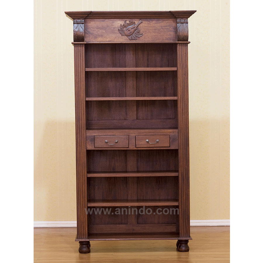 Bookcase 2 drawers carver is made of solid mahogany wood in walnut finish.