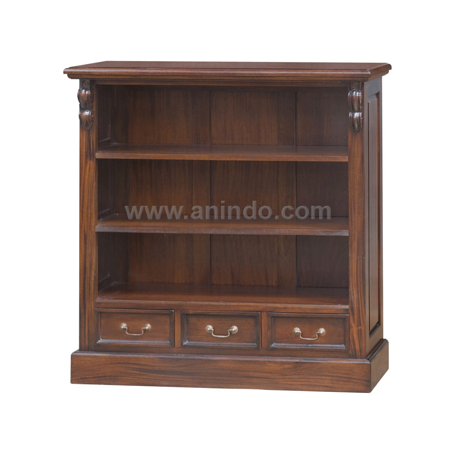 Bookcase 3 drawers with shelves is made of mahogany wood in pecan finish.