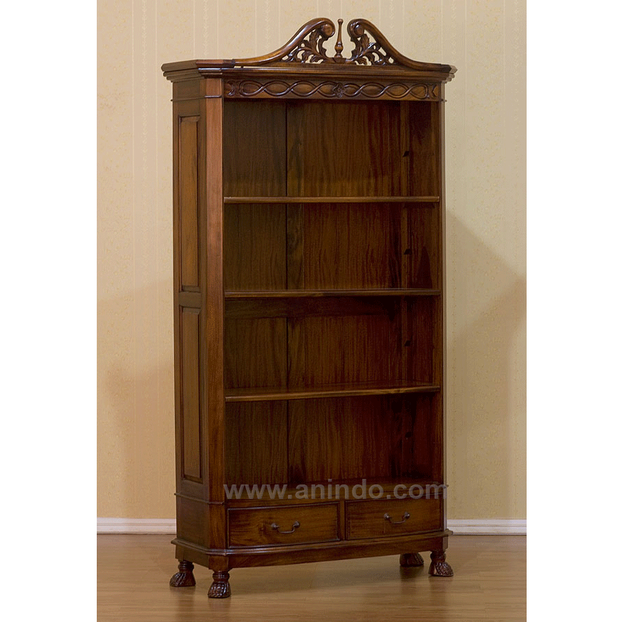 Bookcase 2 drawers carver is made of solid mahogany wood in walnut finish.