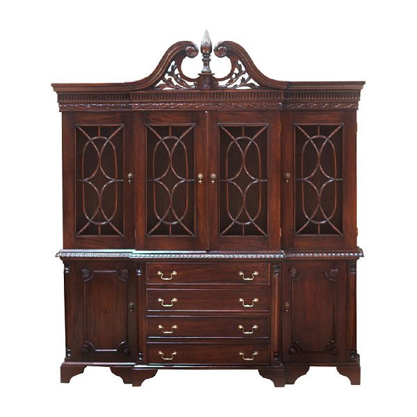 China cabinet 6 doors 4 drawers is made of solid mahogany wood in walnut finish. Gold solid brass handles.