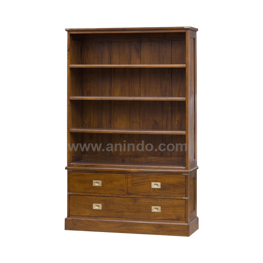 3 shelves open bookcase is made of mahogany wood in pecan finish. Antique solid brass ...