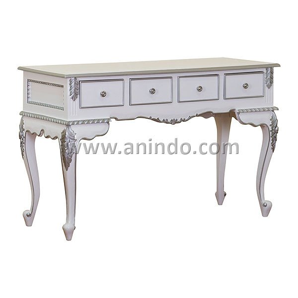 May desk 4 drawers is made of solid mahogany wood in white combined with silver painted finish. Antique solid brass handles.