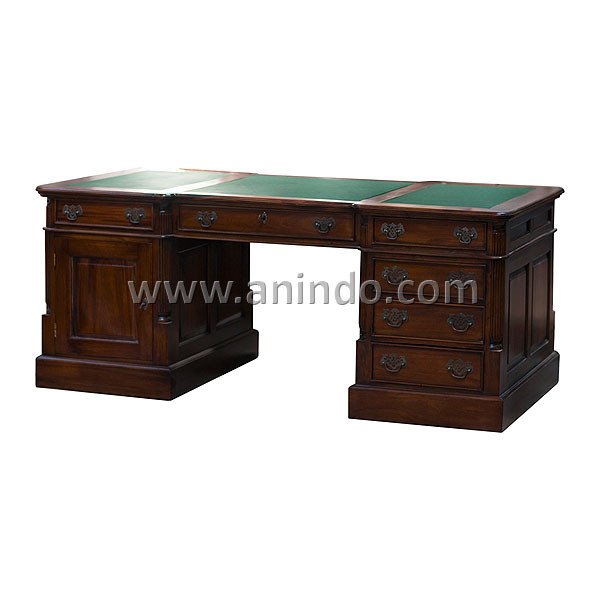 Partner desk 180 cm is made of solid mahogany wood in pecan finish. With embossed green faux leather on top. Antique solid brass handles.